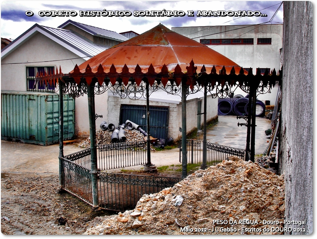 O tempo passou e reencontramos neste Maio de 2012, solitário e abandonado, velho, esfarrapado pela ferrugem mas ainda de pé, lá pelo antigo Matadouro Municipal, quem sabe clamando em surdina angustiada que para si olhem os transeuntes e os responsáveis municipais, o estoico Coreto da Régua ou do fenecido Jardim Alexandre Herculano.