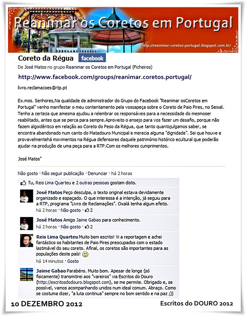No FaceBOOK participe do "Reanimar os Coretos em Portugal"